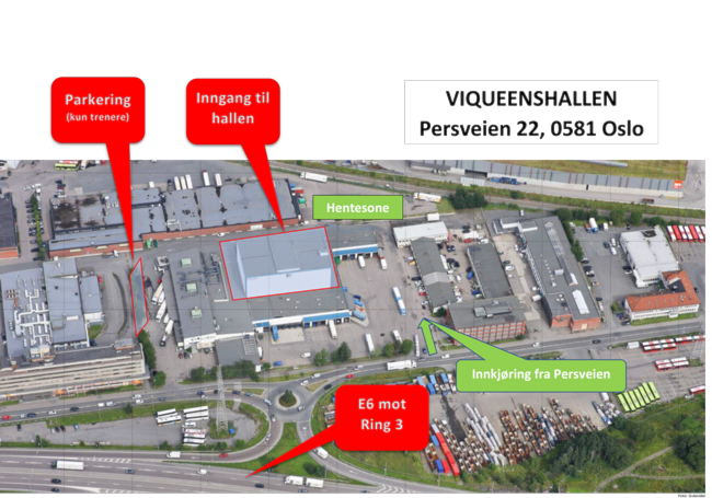Det er begrenset parkeringsmuligheter rett ved hallen for trenere, foreldre og gjester. Vi har 13 Viqueens parkeringsplasser på venstre side av inngangen til hallen. Disse kan benyttes ved besøk i hallen. Disse skal ikke benyttes ved levering og henting av utøvere. Det kan også parkeres på kundeplassene til Optimera, som ikke benyttes på kveldstid.